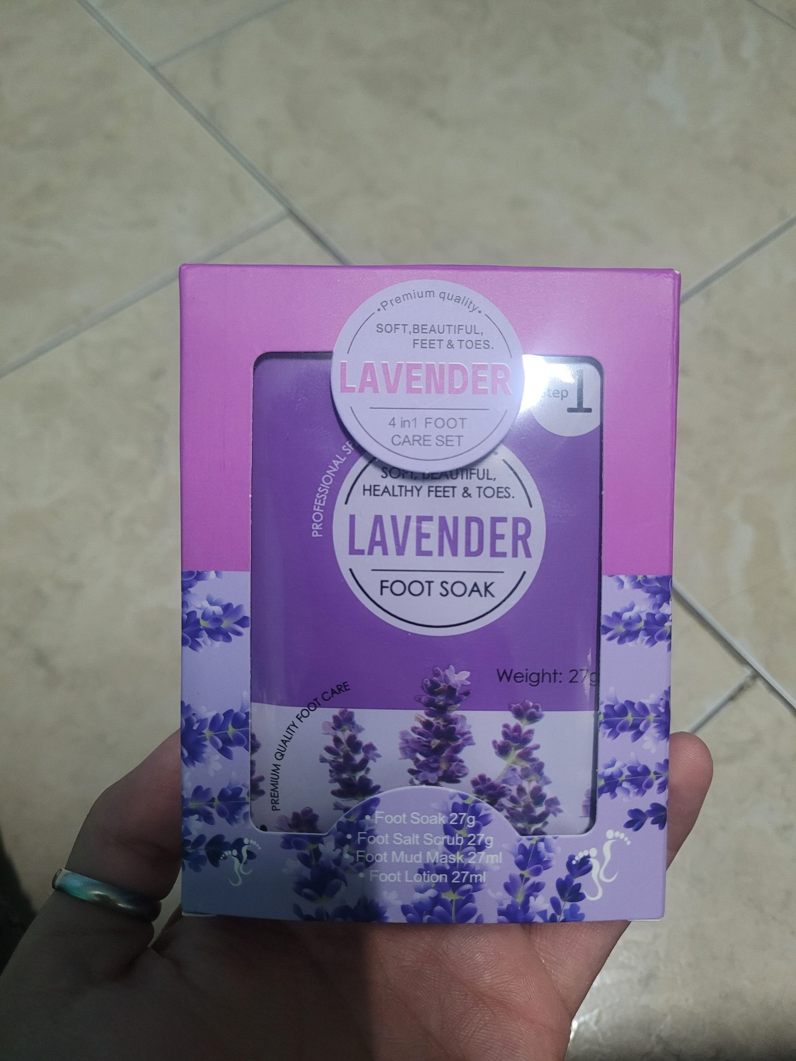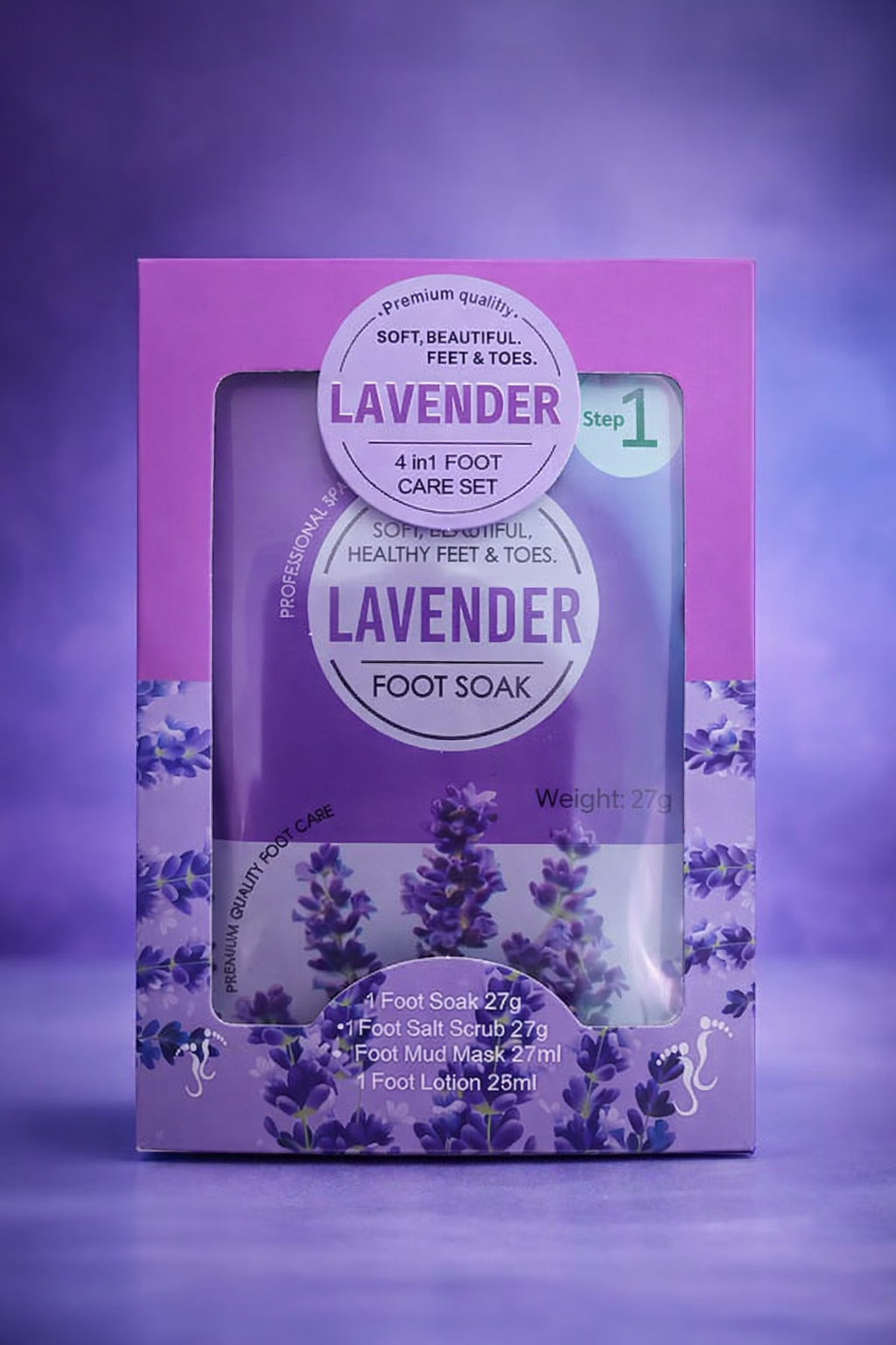 Set de cuidado para pies con lavanda 4 en 1 que ayuda a eliminar hongos y bacterias, aliviar pies cansados y adoloridos, y mantener la piel hidratada y saludable. Incluye tratamiento en cuatro pasos para limpiar, nutrir y suavizar los pies, dejándolos frescos, suaves y con un aroma relajante.